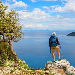 • Мы поднимаемся на 260 метров и дальше двигаемся без существенных спусков и подъёмов. Идём среди лесов по грунтовой дороге и к вечеру выходим на площадку с которой открывается великолепный вид на бирюзовое море и греческие острова на горизонте.
